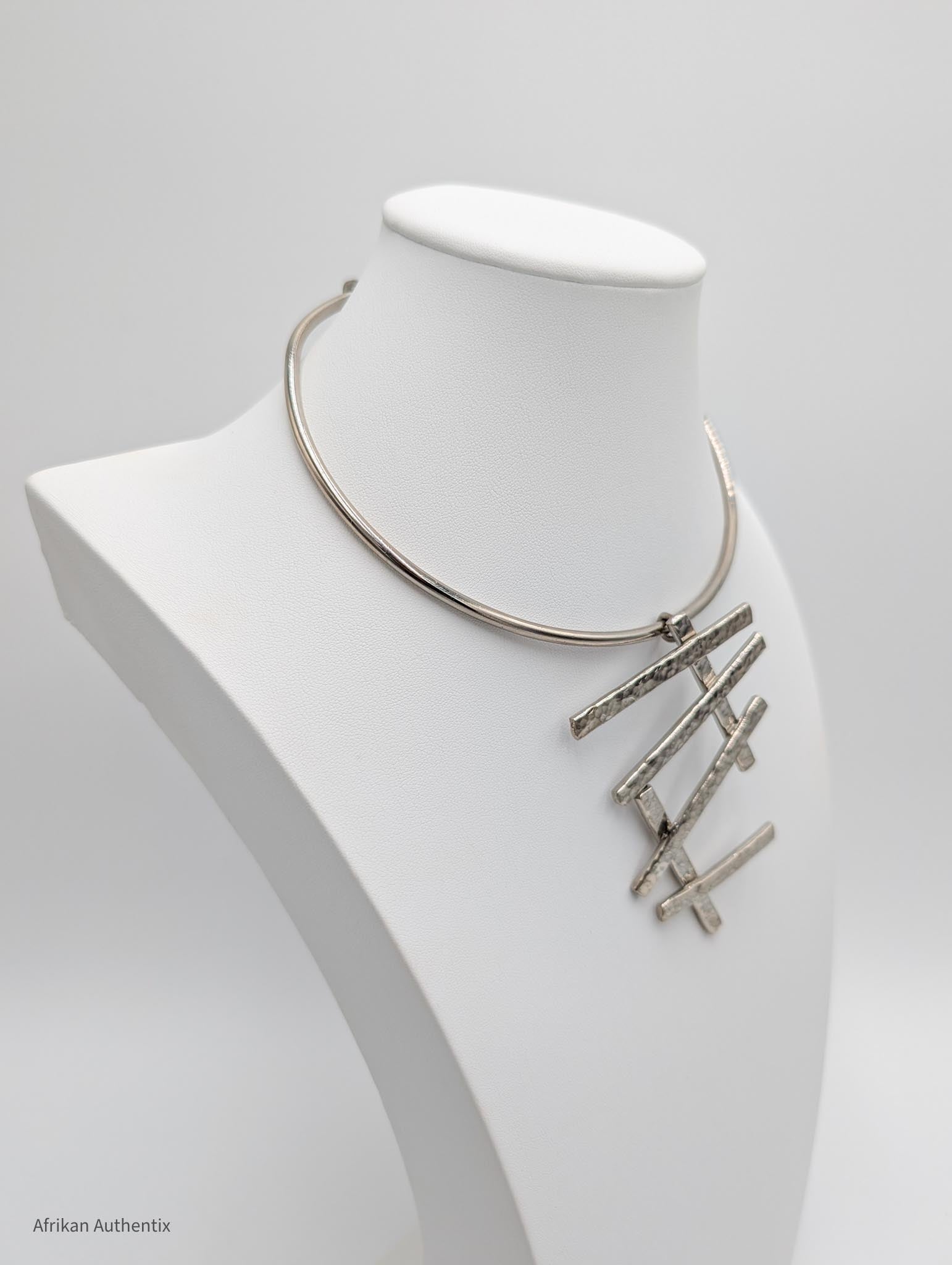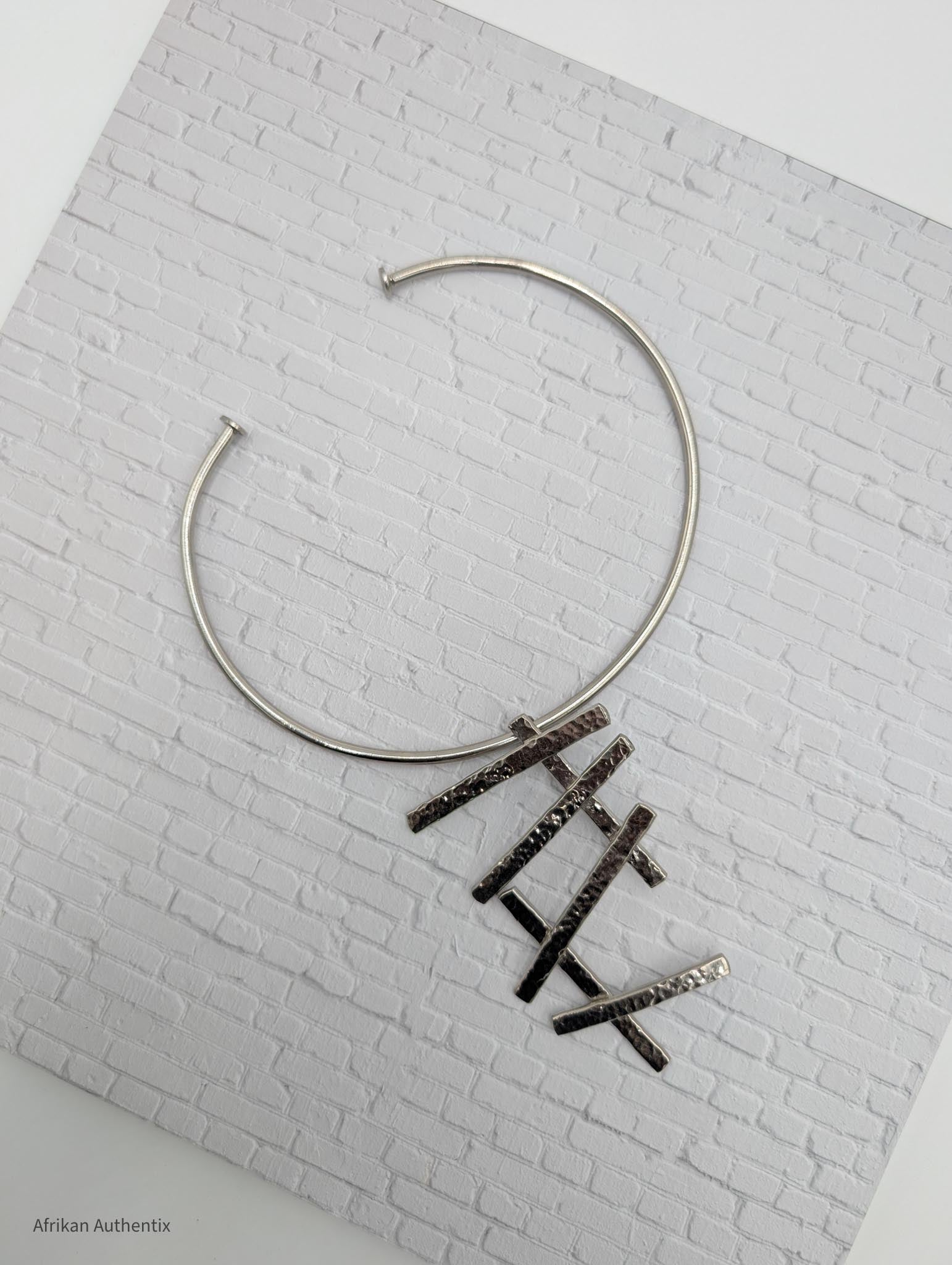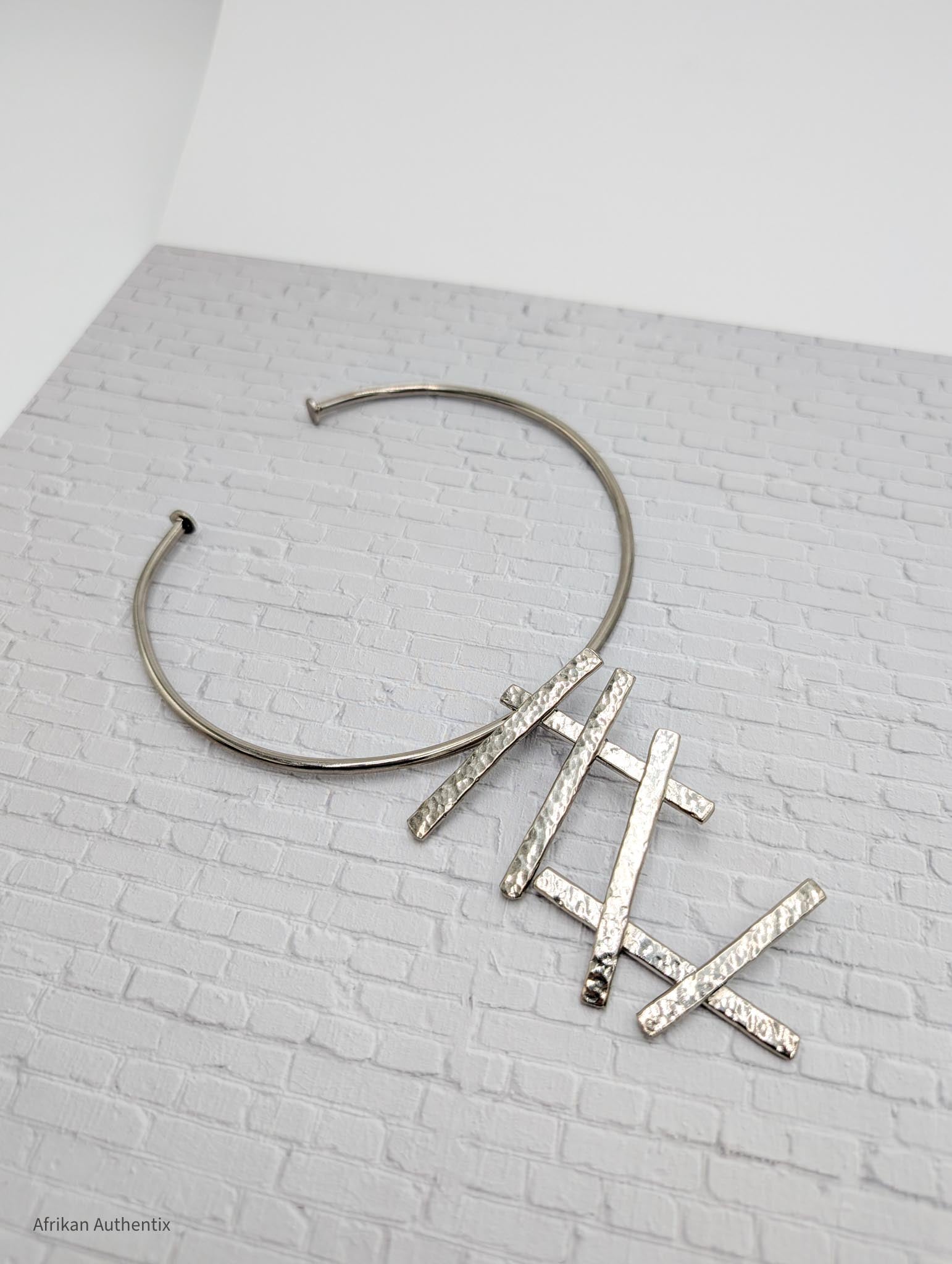The Abeni Silver Geometric Collar Necklace is a contemporary statement necklace handcrafted in Kenya by skilled artisans. Featuring an architectural, layered pendant design, this choker blends African craftsmanship with modern, editorial aesthetics.