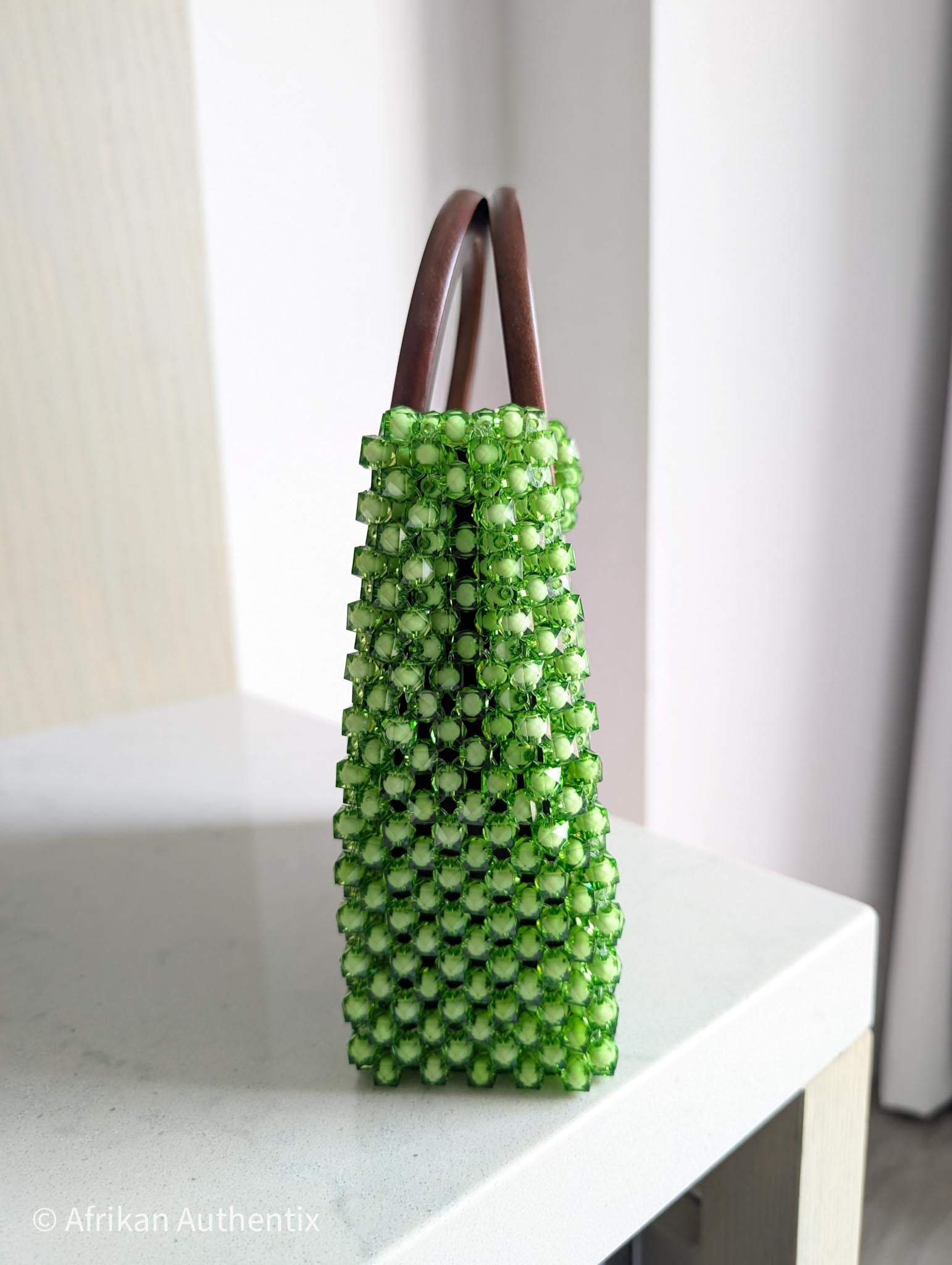 Bold. Structured. Unforgettable. This green beaded square handbag is handcrafted in Ghana and finished with a sleek black sculptural handle. Designed to command attention, it’s the perfect balance of artistry and modern elegance.